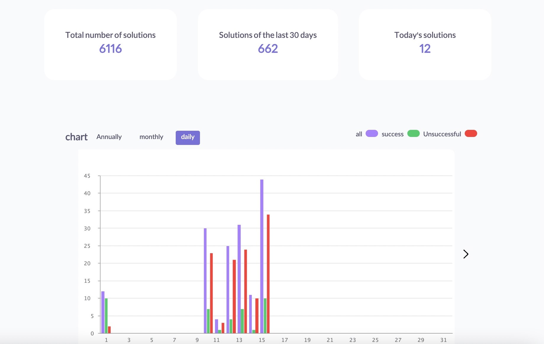 The ARCaptcha collector module collects and processes request information and provides you with a detailed performance report. Requests that are from human users and are correctly resolved and requests that are not correctly resolved are collected by day and month. It is also possible to customize reports according to business needs and can include weekly or monthly reports of consumption, possible attacks and more detailed information about requests such as suspicious IPs.